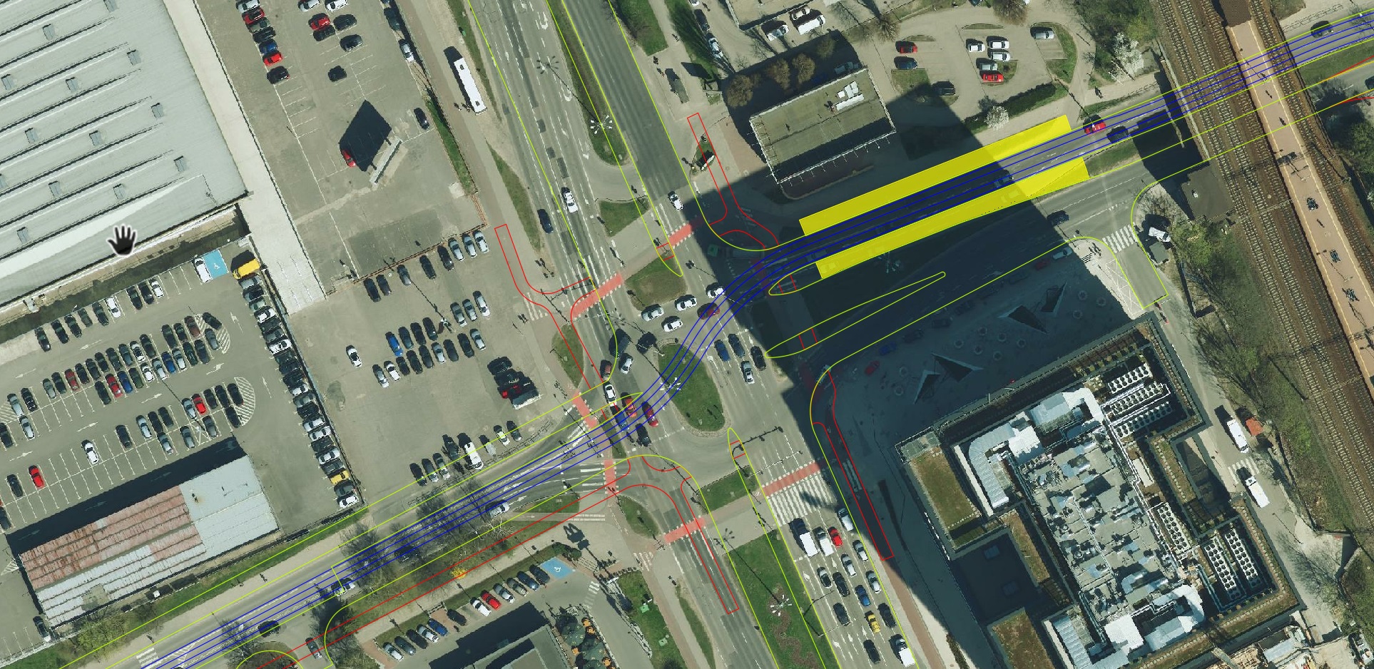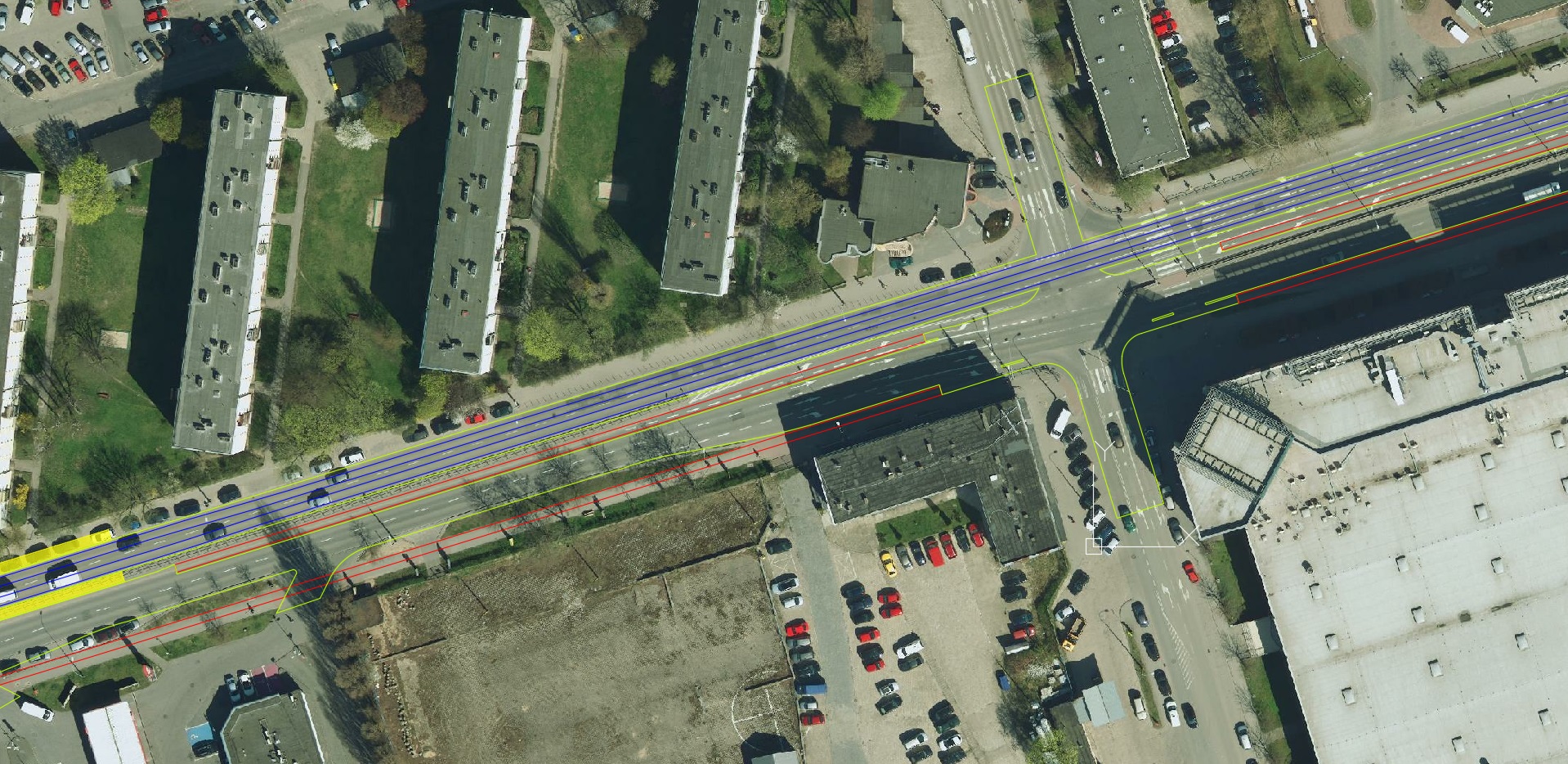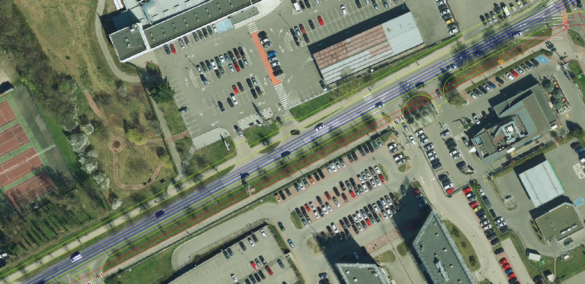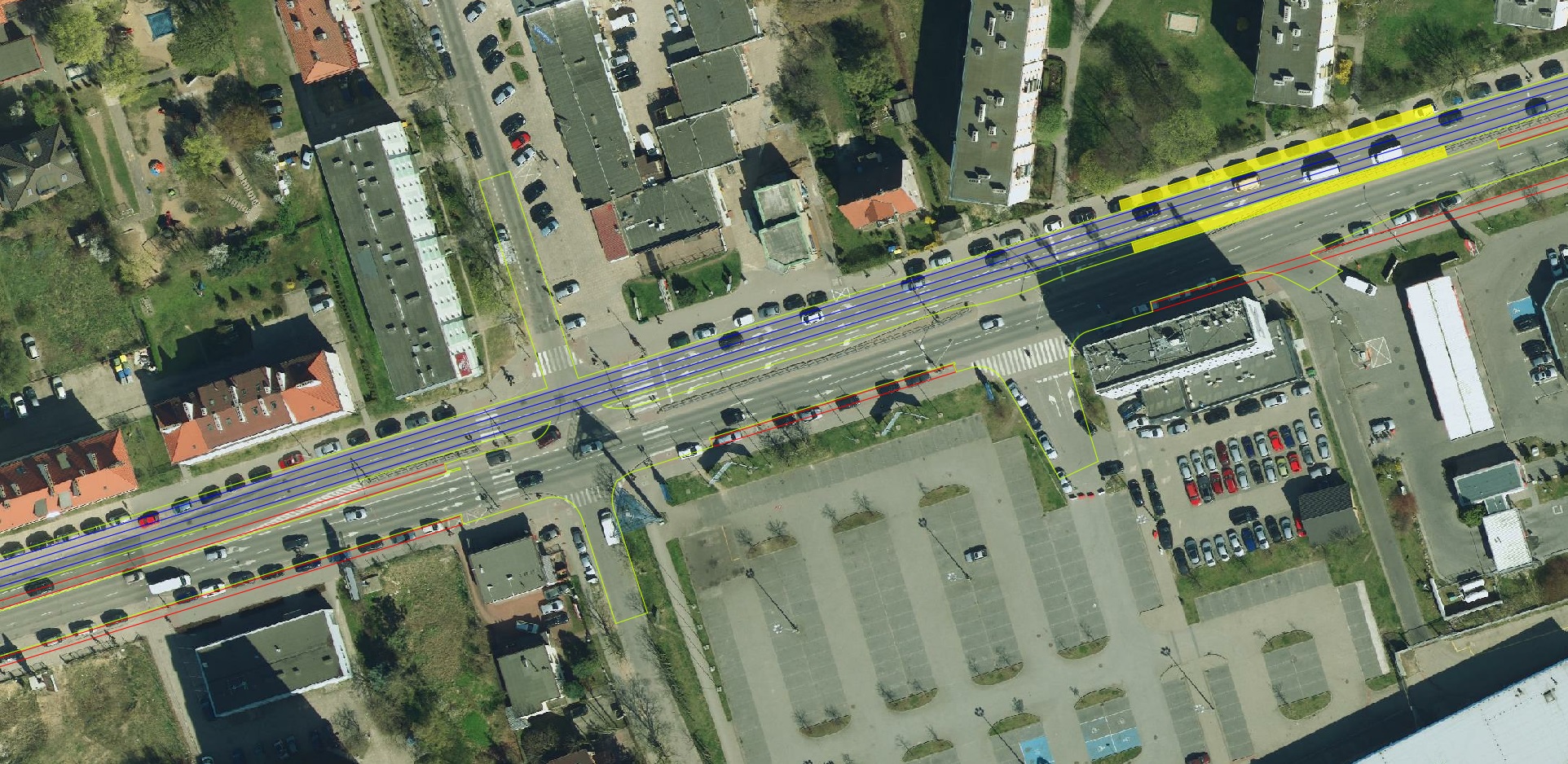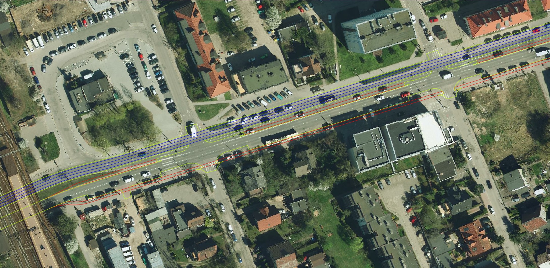 Ortofotomapa z zaznaczonymi tylko torami, krawędziami jezdni i ścieżek rowerowych: