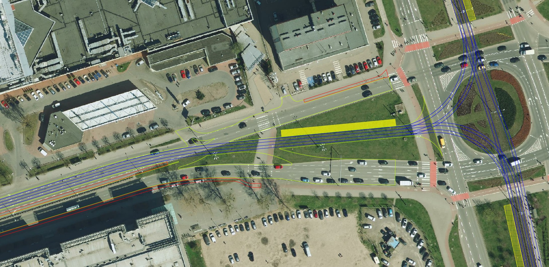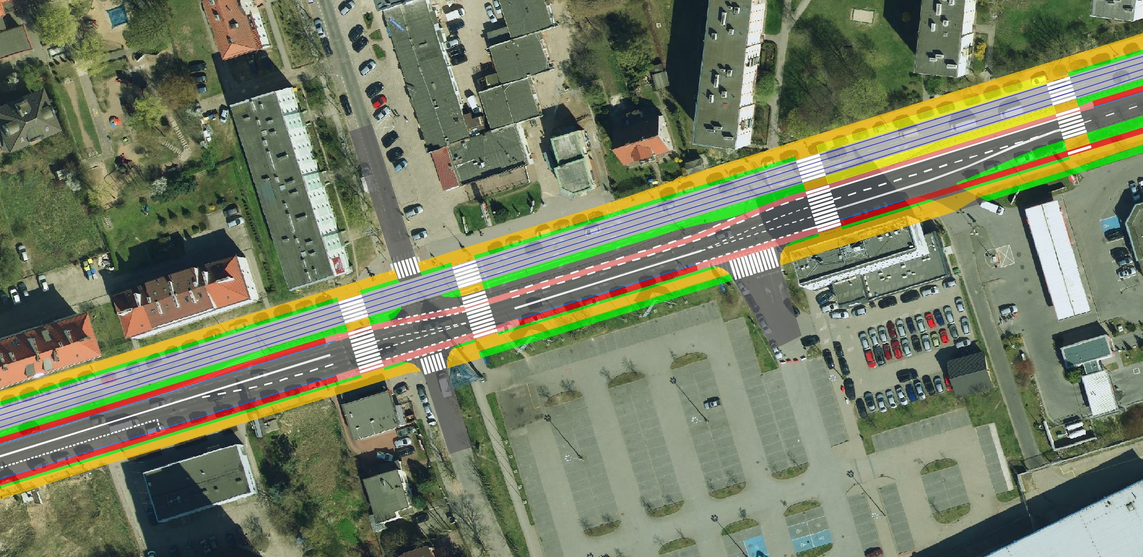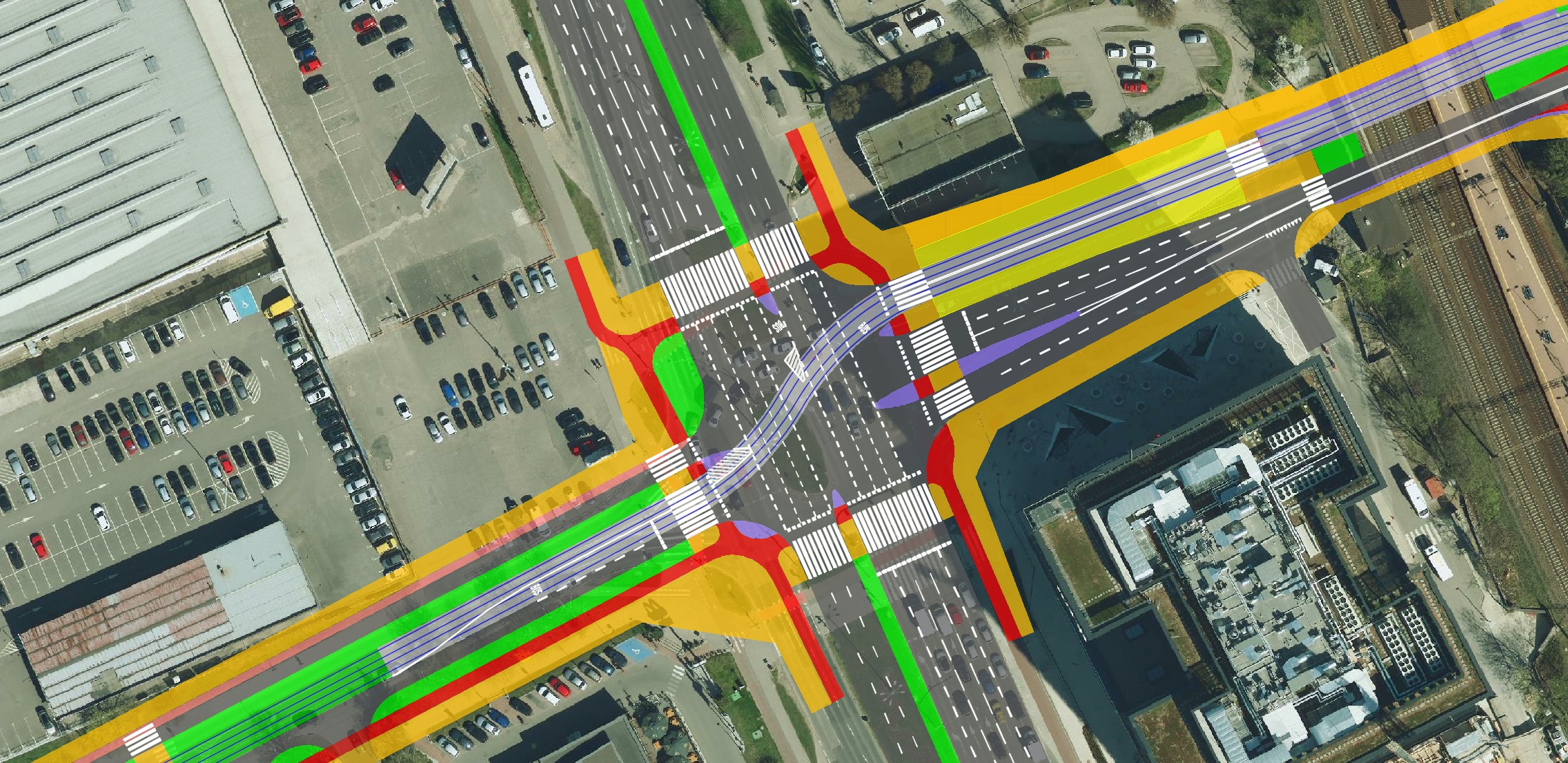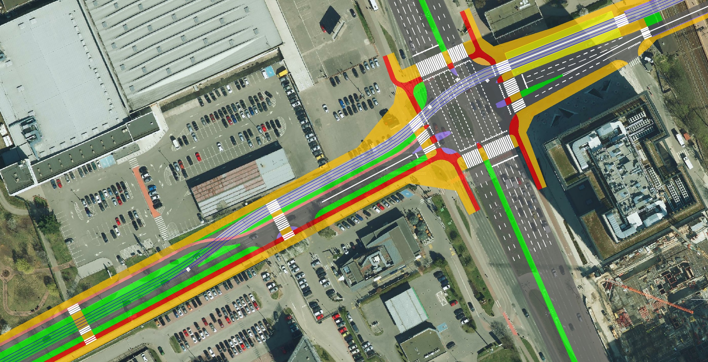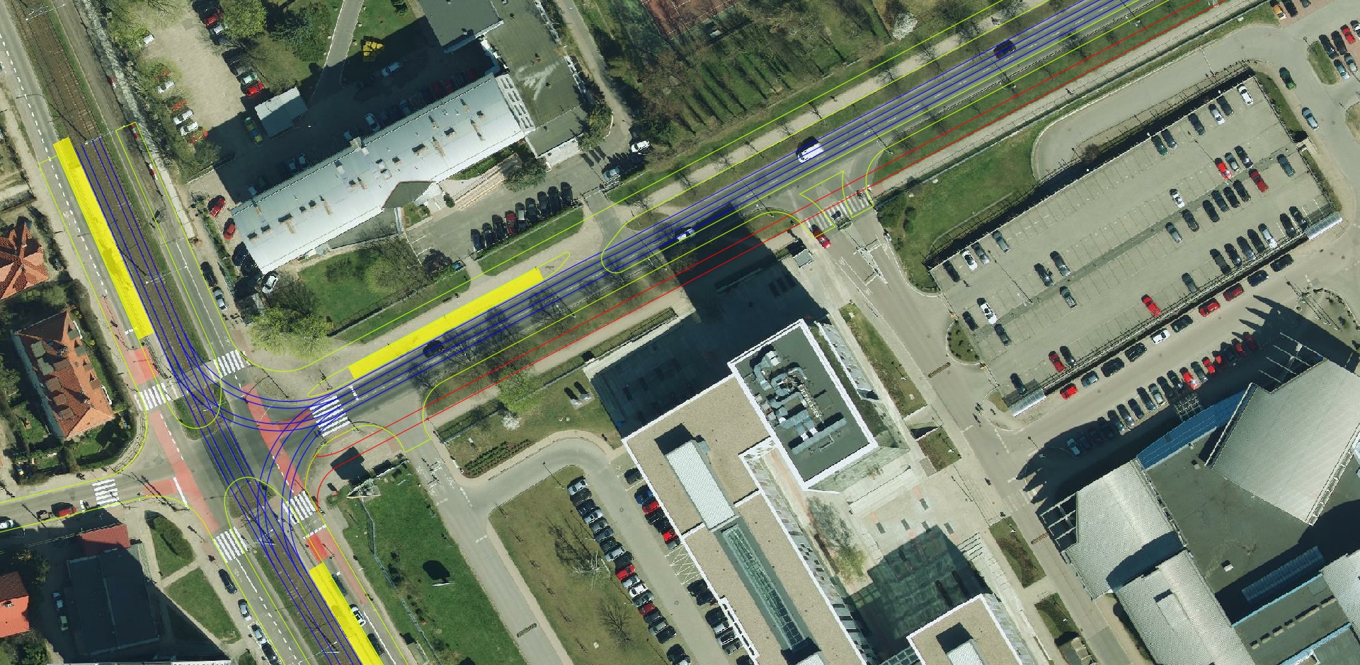 Ortofotomapa z zaznaczonymi tylko torami, krawędziami jezdni i ścieżek rowerowych: