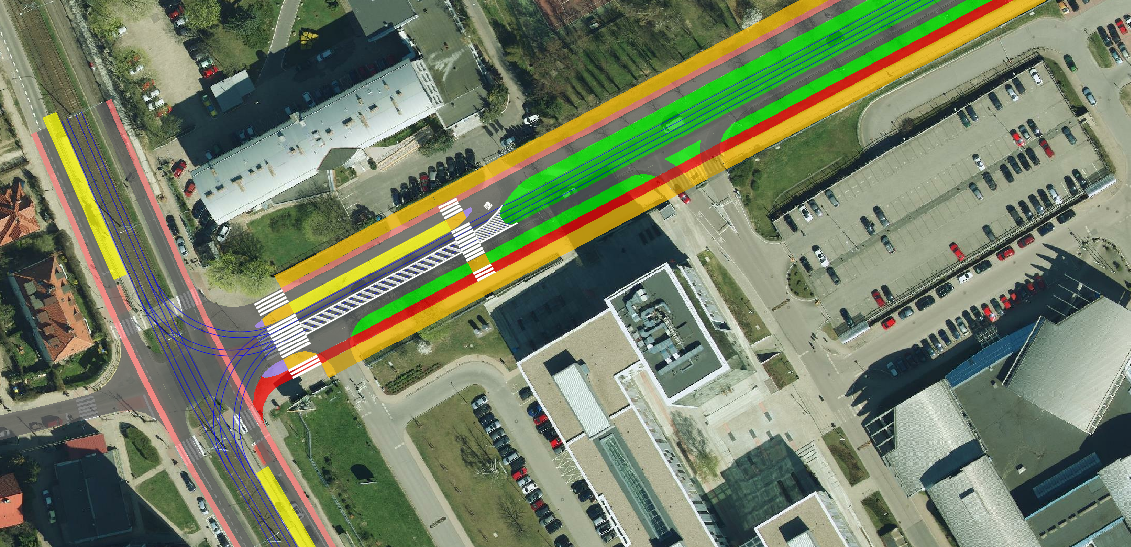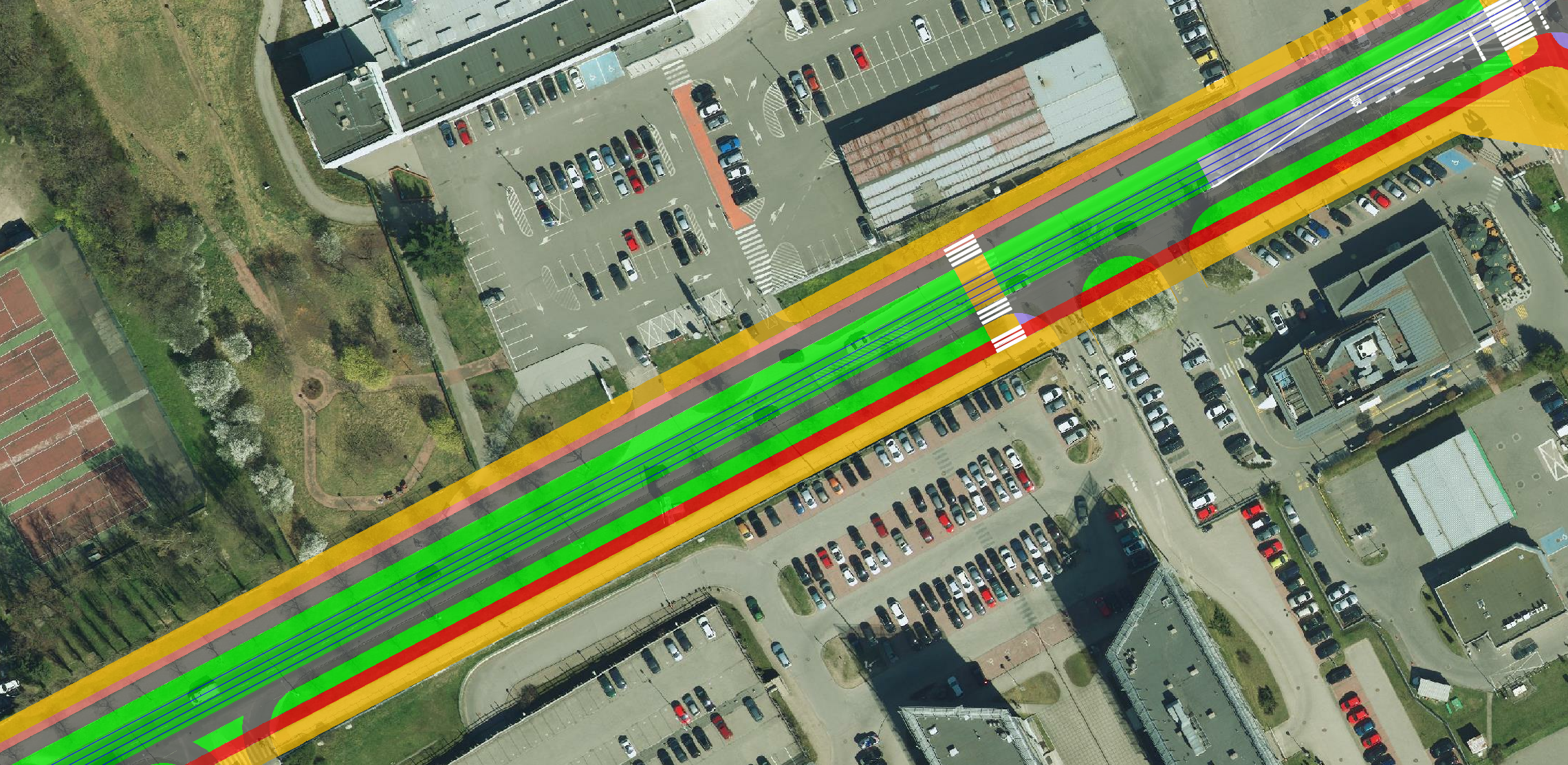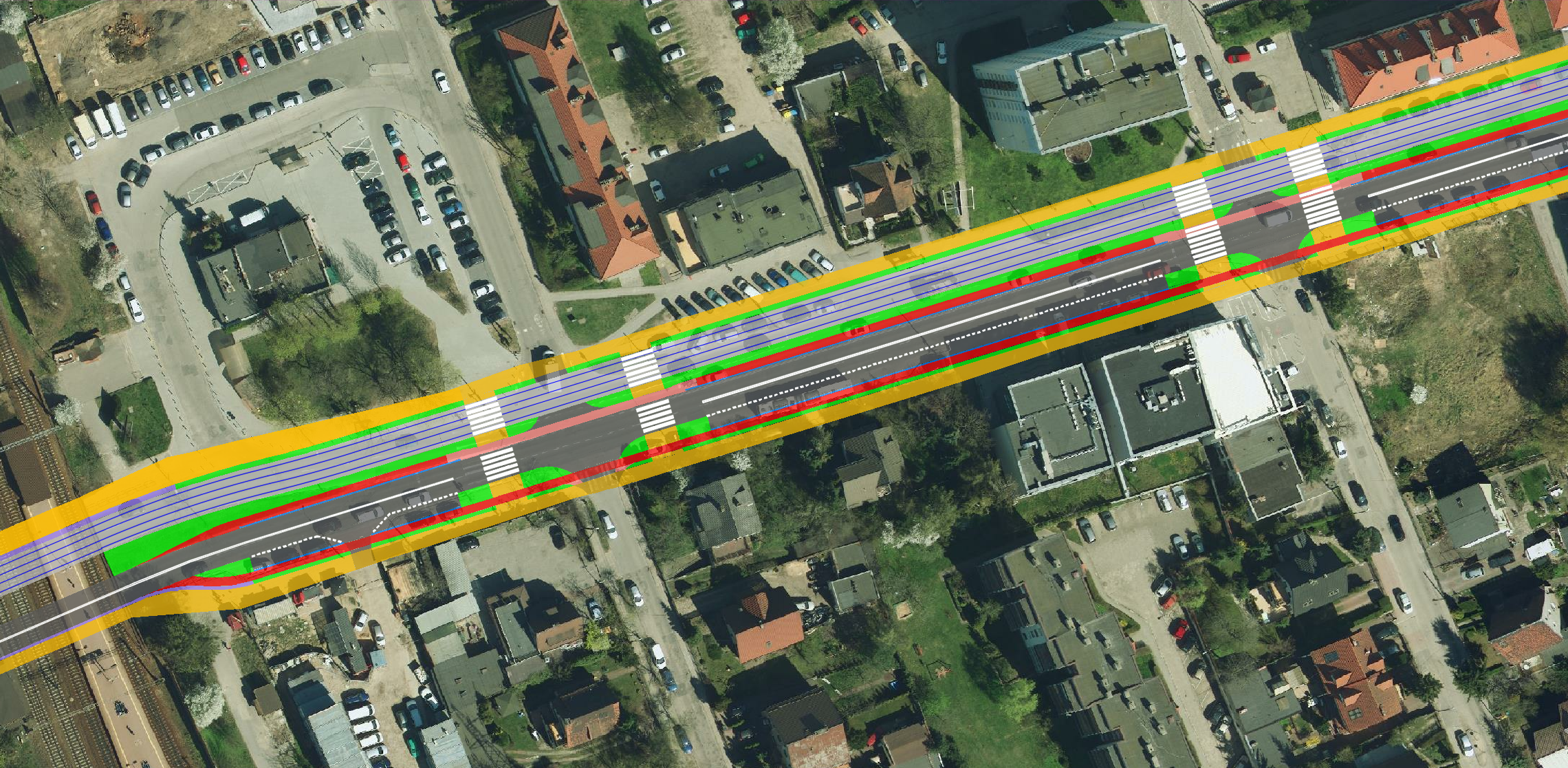 Ortofotomapa z zaznaczonymi tylko torami, krawędziami jezdni i ścieżek rowerowych: