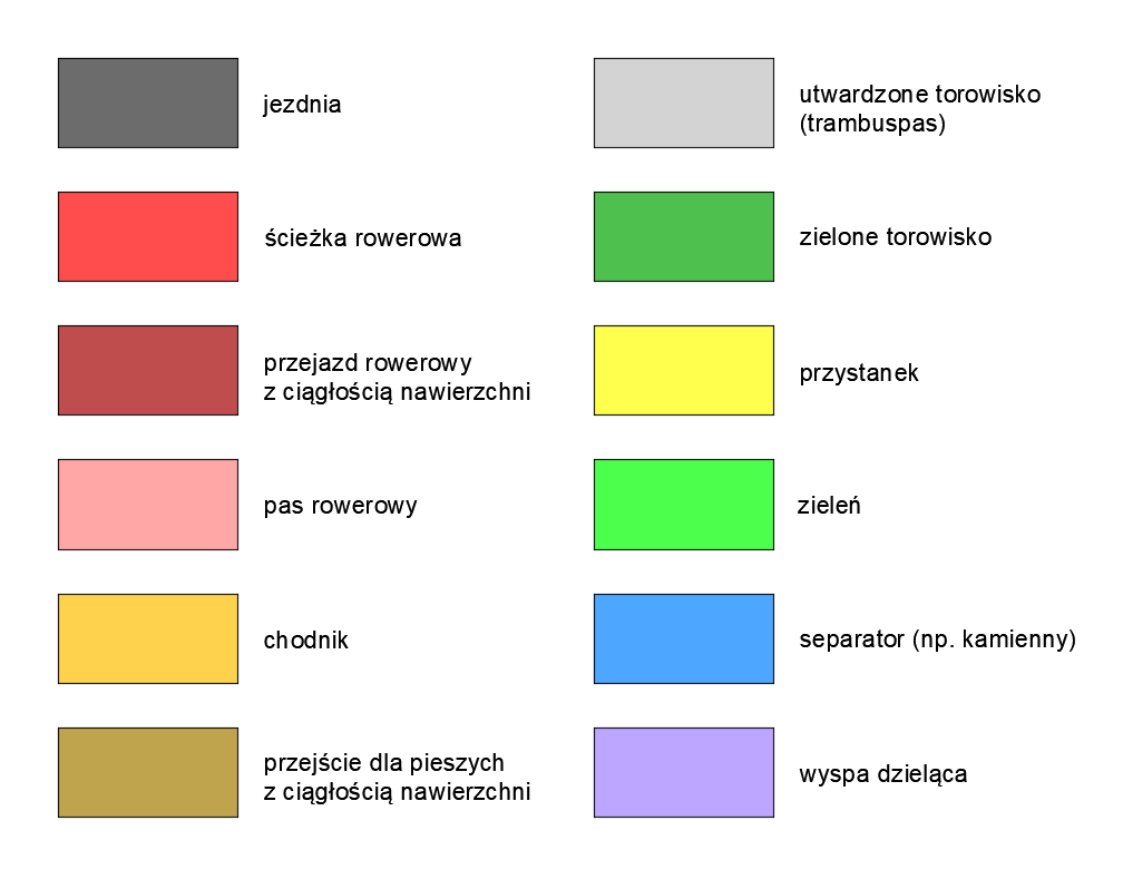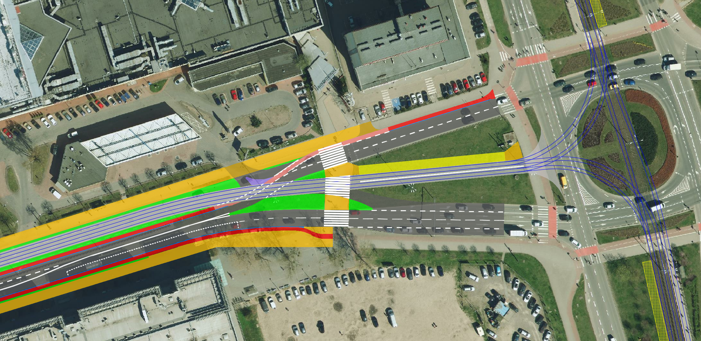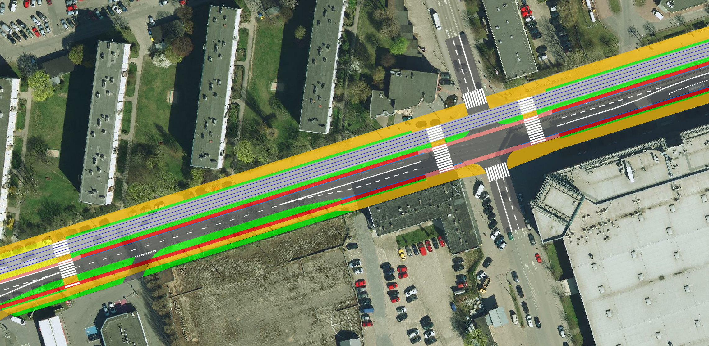 Ortofotomapa z zaznaczonymi tylko torami, krawędziami jezdni i ścieżek rowerowych: